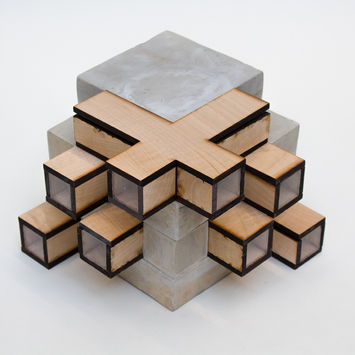 I experimented with Rock-ite powdered cement with the construction of multiple molds as a solid base of structure. Next sheets of 3/16" Oak wood sheets and Plexiglass were lasercut as planar and linear extrusions of form.